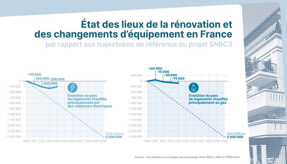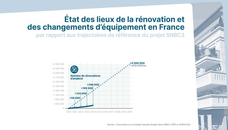 Les statistiques réelles des rénovations d’ampleur restent bien moindres que les objectifs visés par les politiques européennes et françaises, qu’il s’agisse des travaux d’isolation ou des changements d’équipements pour sortir du fioul et du charbon par exemple.