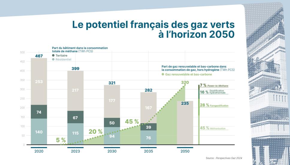 Avec la montée en puissance des autres gaz renouvelables et bas carbone, la filière considère que les gaz verts pourront couvrir 20 % de toute la consommation française en 2030, plus de 40 % en 2035 et 100 % à horizon 2050, avec un potentiel de production à long terme estimé à 320 TWh par année.