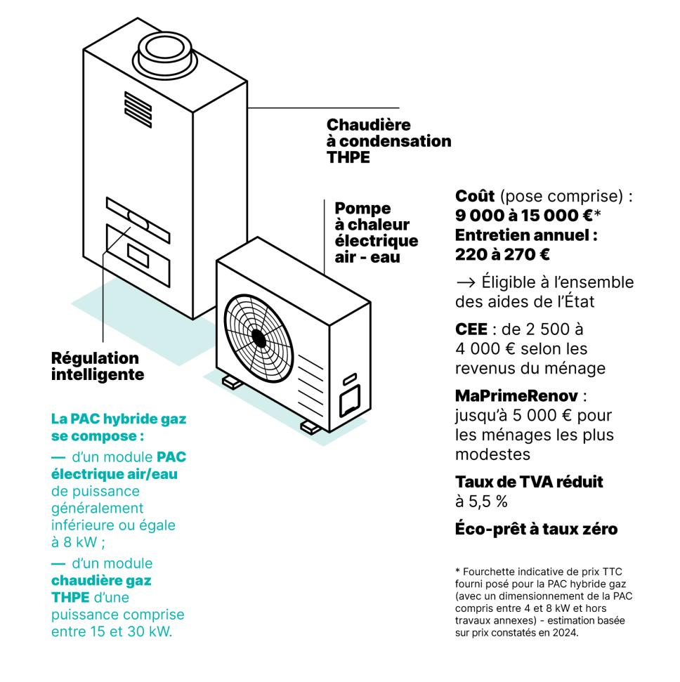 Aides très avantageuses (primes, prêt bonifié) et tarif de l’énergie spécifique pour les PAC hybrides.