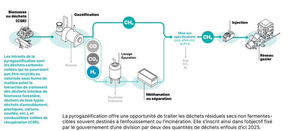 La pyrogazéification est un procédé thermochimique à haute température - entre 800 et 1 400°C – et en absence ou en défaut d’oxygène, qui valorise sous forme de gaz des résidus organiques solides renouvelables ou non renouvelables. Après traitement et épuration, le gaz vert produit peut être directement injecté dans les réseaux gaziers.