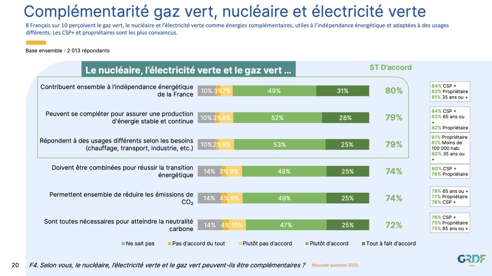 Près de 8 Français sur 10 perçoivent le gaz vert, l’électricité verte et le nucléaire comme des énergies complémentaires, répondant à des enjeux distincts et stratégiques.