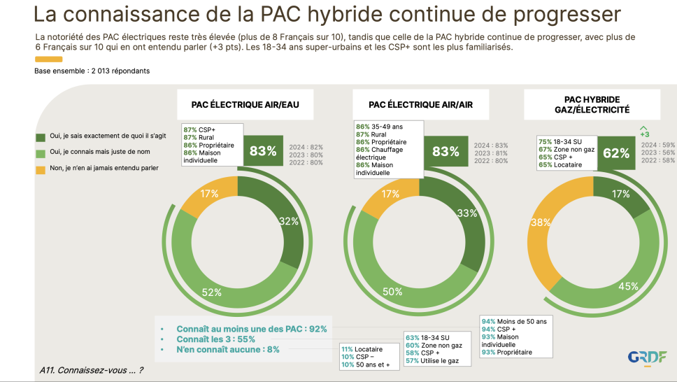 L’étude montre un intérêt croissant pour les solutions hybrides : la notoriété et l’attractivité de la PAC hybride progressent.